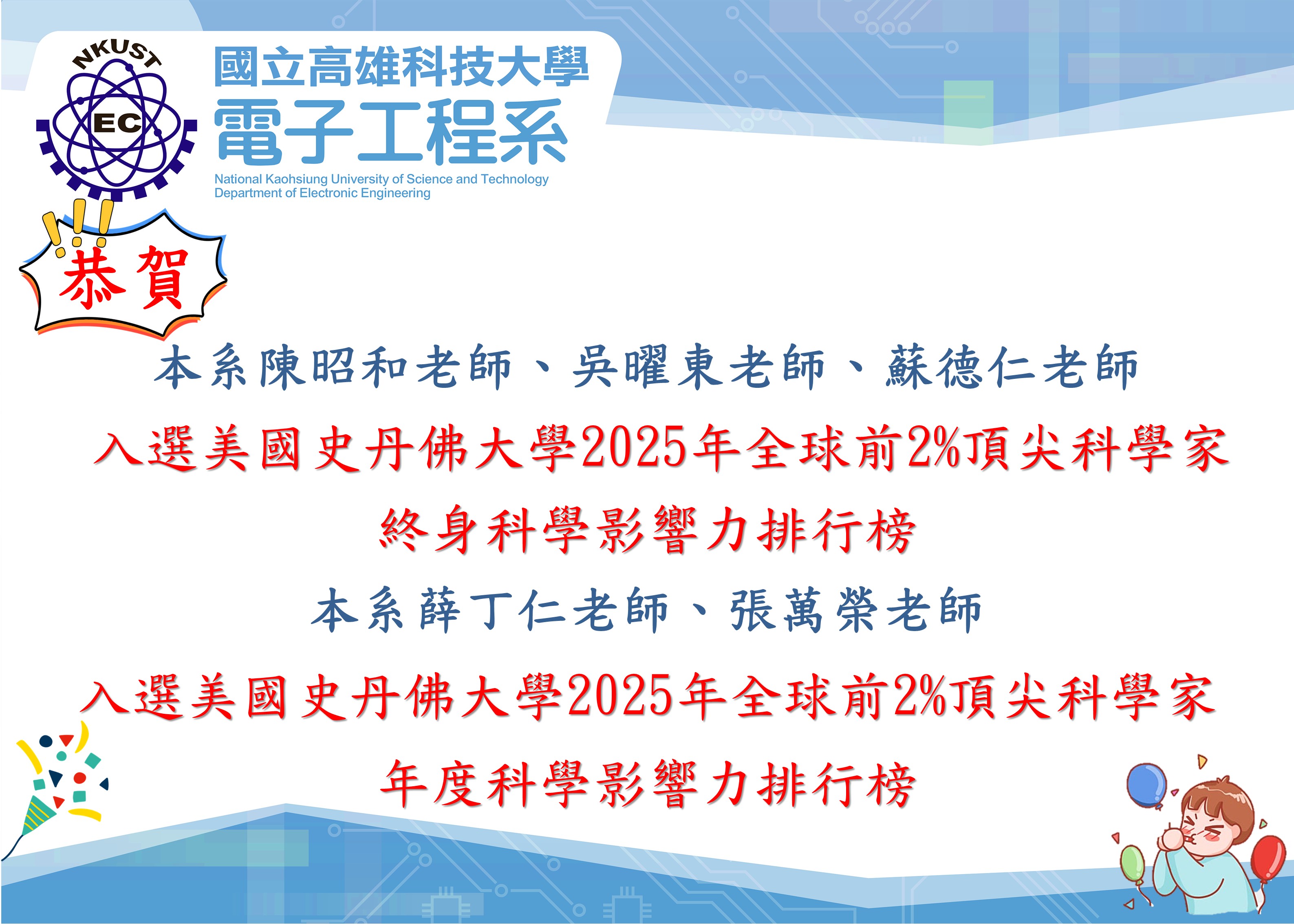 恭賀本系老師們入選美國史丹佛大學2025年全球前2%頂尖科學家終身科學影響力及年度科學影響力